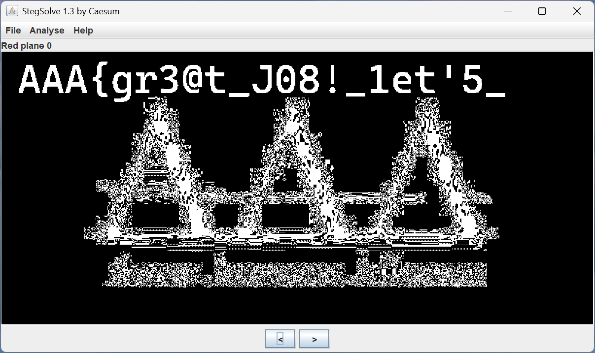 根据提示,这张图片使用了一种最基础的图片隐写技术 LSB 隐写。LSB 隐写是指将信息嵌入到图片的最低有效位中,根据搜索,我们可以使用 Stegsolve 来提取隐藏的信息。