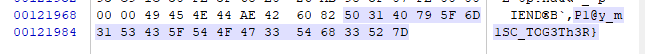 根据提示,我们需要查看图片的内容,那么我们使用 winhex 来看看图片文件中的信息,当我们翻到最下面的时候,就可以发现第二部分,也就是 P1@y_m1SC_TOG3Th3R}。