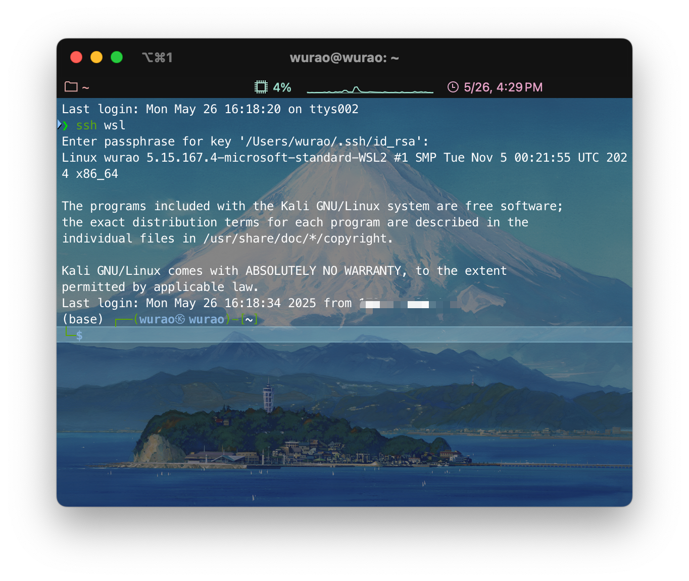 本人目前拥有 MacOS 和 Windows 电脑各一台,在 Linux 环境的选择上,我选择直接使用 WSL,选择了 Kali Linux 作为 WSL 的发行版。Mac 上本身是 类 Unix 系统,最初我是打算用 moonlight + sunshine 来直接串流,若有需要使用 Linux 的地方,再从 Windows 中打开 WSL。但总感觉这样有点怪,后来依然配置了 ssh 来用 Mac 连接 WSL。