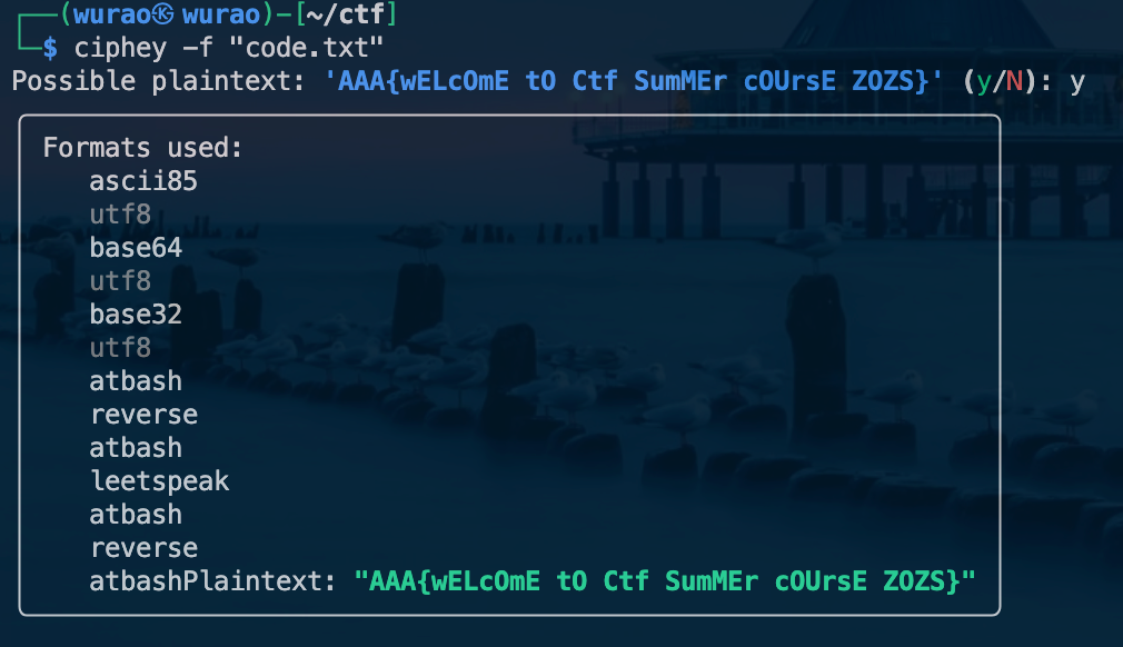 用 Ciphey 可直接拿到 flag 为 AAA{wELcOmE tO Ctf SumMEr cOUrsE ZOZS}。