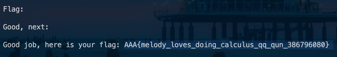 运行脚本后,成功拿到了 flag 为 AAA{melody_loves_doing_calculus_qq_qun_386796080}。
